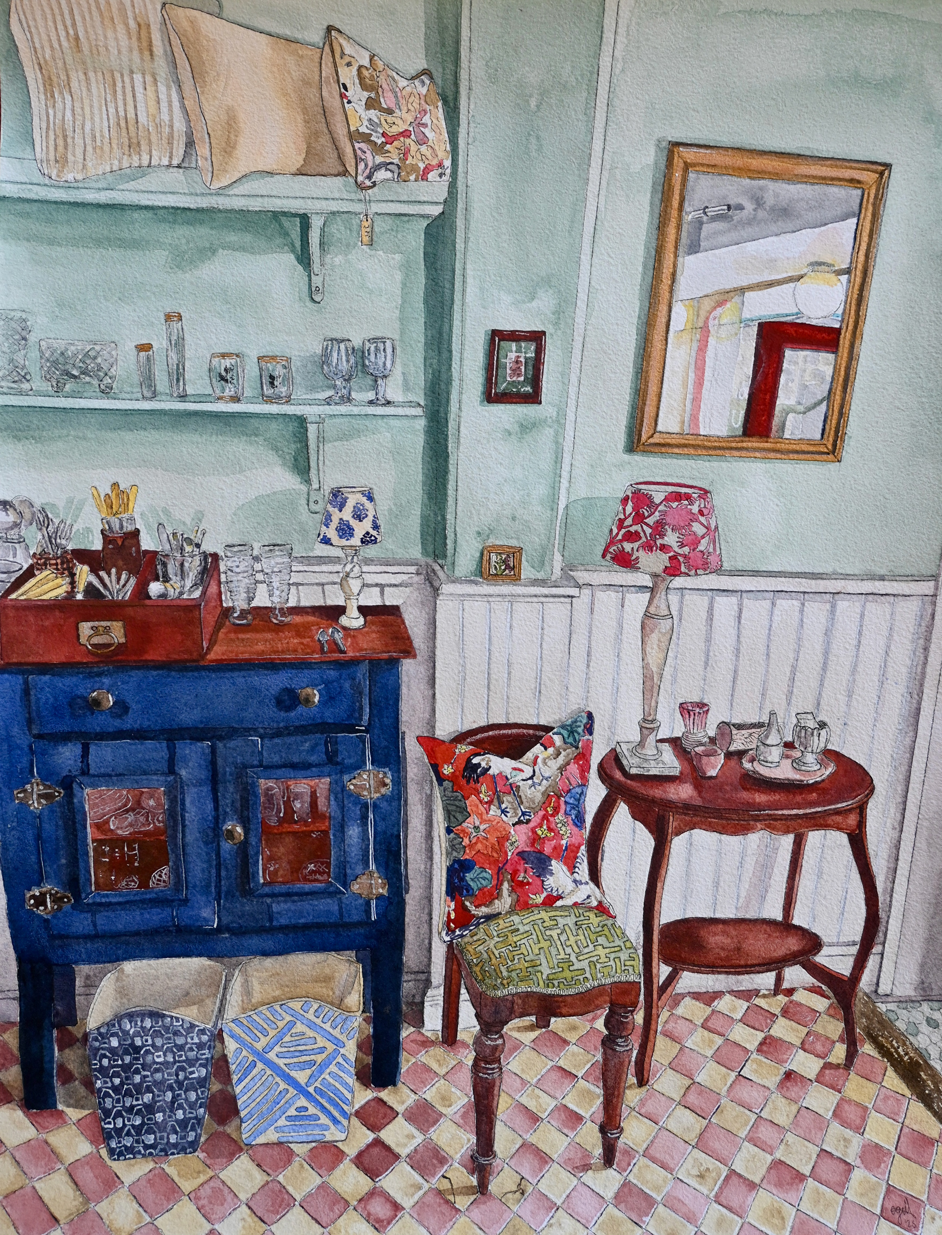 Home Industry, watercolour on paper, 38 x 49cm. Home Industry is a beautiful store located in Balmain East in Sydney NSW. They are a bespoke furnishings store featuring restored furniture, homewares and quality fabrics for interiors.