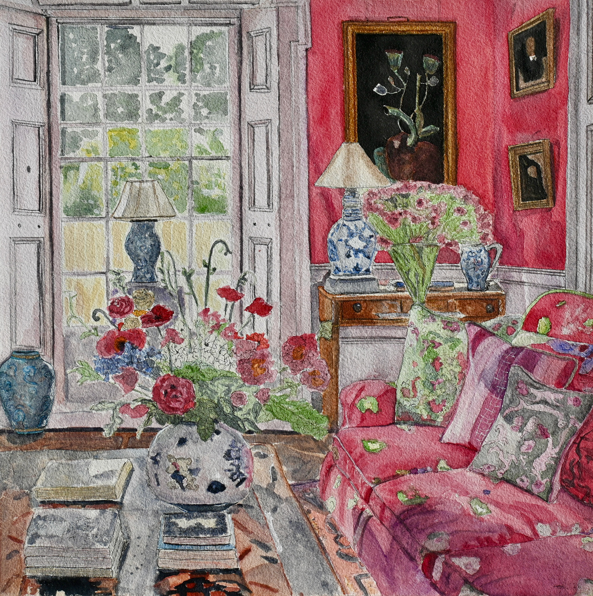 The Pink Sitting Room, watercolour on paper, 38 x 38cm.